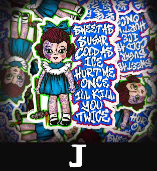 J- SWEET AS SUGAR " SWEET AS SUGAR, COLD AS ICE, HURT ME ONCE, I'LL KILL YOU TWICE" don't think any explanation is needed for this baddie 4X3.5 INCHES