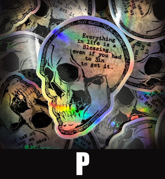 P- HOLOGRAPHIC BLESSED SKULL "EVERYTHING IN LIFE IS A BLESSING, EVEN IF YOU HAD TO SIN TO GET IT" 3X2.75 INCHES
