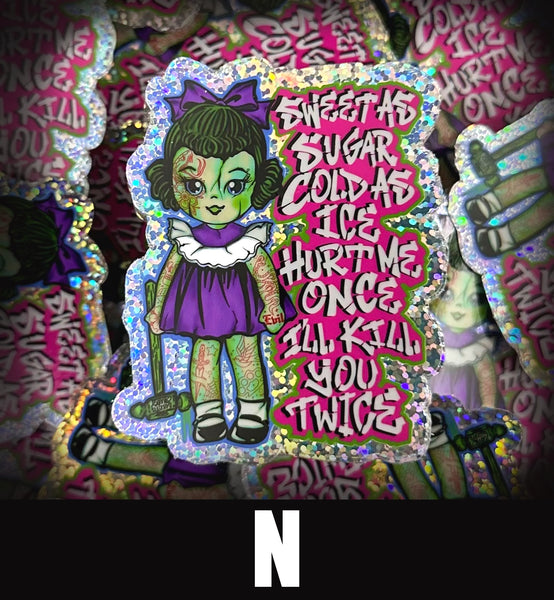 N- GLITTER SWEET AS SUGAR " SWEET AS SUGAR, COLD AS ICE, HURT ME ONCE, I'LL KILL YOU TWICE" don't think any explanation is needed for this baddie 3 X 2.52 INCHES