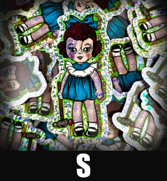 S- SWEET AS SUGAR DOLL GLITTER " SWEET AS SUGAR, COLD AS ICE, HURT ME ONCE, I'LL KILL YOU TWICE" WRITTEN ON THE SIDE OF THIS SMALLER DESIGN 3X1.5 INCHES