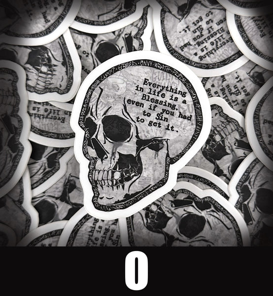 O- BLESSED SKULL "EVERYTHING IN LIFE IS A BLESSING, EVEN IF YOU HAD TO SIN TO GET IT" 3X2.75 INCHES