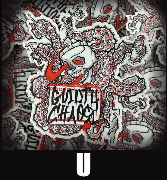 U- SKULLTOPUS THIS MAY BE ONE OF MY FAVORITE DESIGNS. THIS SKULLTOPUS IS ARMED WITH ALL THE TOOLS NECESSARY TO CREATE. Spray can, fat markers, tattoo machine, hammer, saw, paintbrushes and of course the GUILTY CHAOS slap logo. this biggie is 5.24x5.96 INCHES
